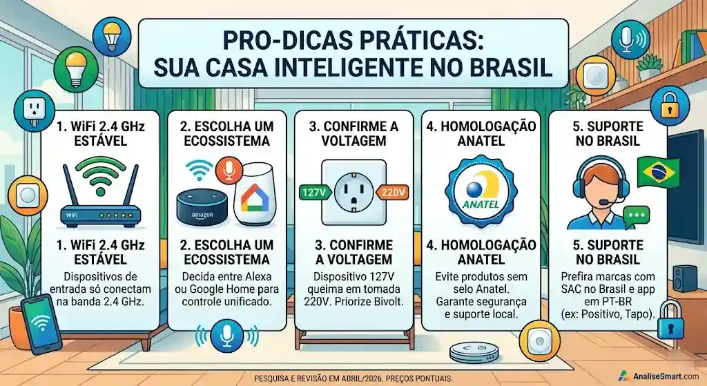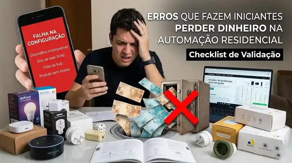 O problema é que no Brasil a compra errada acontece antes da instalação. Produto com voltagem incompatível, dispositivo que não conecta em rede 5 GHz, equipamento sem homologação Anatel e sem suporte local. Tudo isso trava o iniciante antes do primeiro comando de voz.