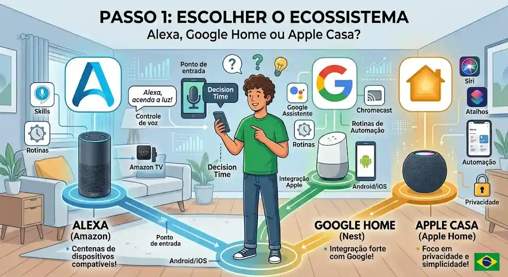 Passo 1: Escolher o Ecossistema Alexa, Google Home ou Apple Casa