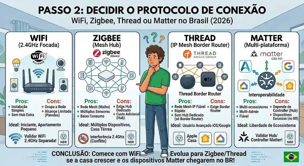 Passo 2: Decidir entre WiFi, Zigbee, Thread e Matter no Brasil em 2026