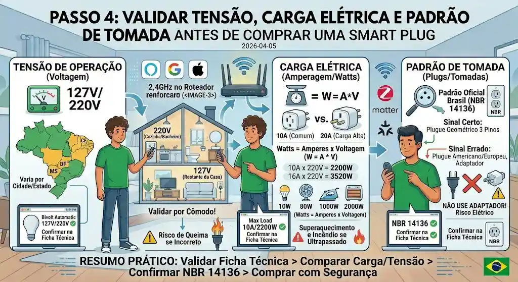 Verifique homologação Anatel (radiofrequência e segurança técnica), padrão de plugue NBR 14136 (segurança elétrica) e carga máxima suportada (compatibilidade com o aparelho que vai ser conectado). Esses três critérios juntos cobrem os riscos mais comuns de instalação e uso de produtos para automação residencial no Brasil.