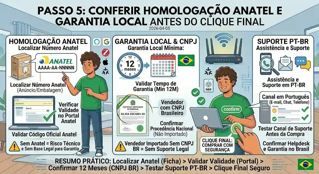 Correção: Valide homologação Anatel, garantia mínima de 12 meses e vendedor com CNPJ brasileiro antes de confirmar a compra. Preço baixo sem essas garantias é custo alto disfarçado de economia.