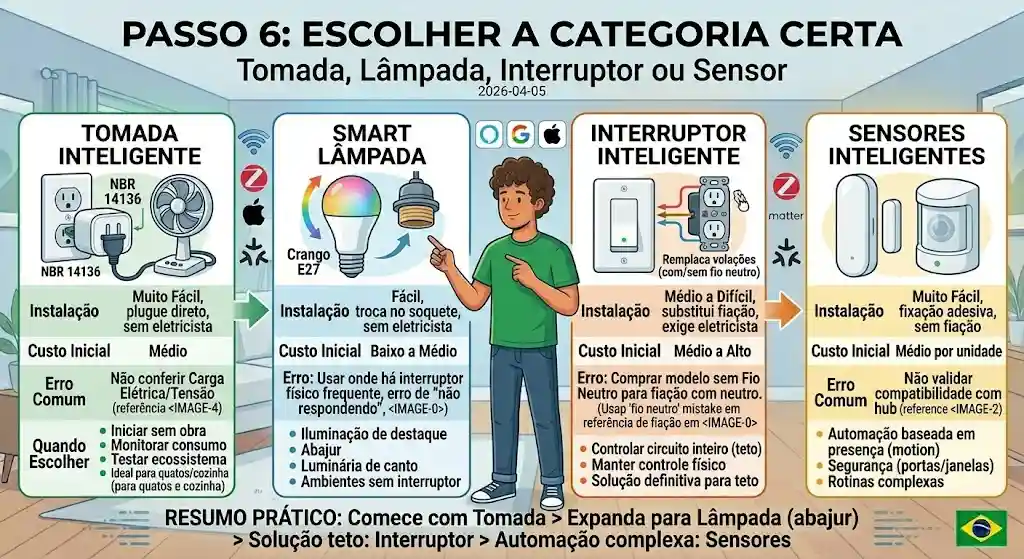 Comece pelo ecossistema (Alexa, Google Home ou Apple Casa), valide que sua rede 2.4GHz está ativa e separada, depois escolha uma tomada inteligente ou lâmpada como primeiro dispositivo. Esses dois produtos têm instalação simples, sem necessidade de eletricista, e permitem testar app, voz e automações com o menor risco possível de erro.